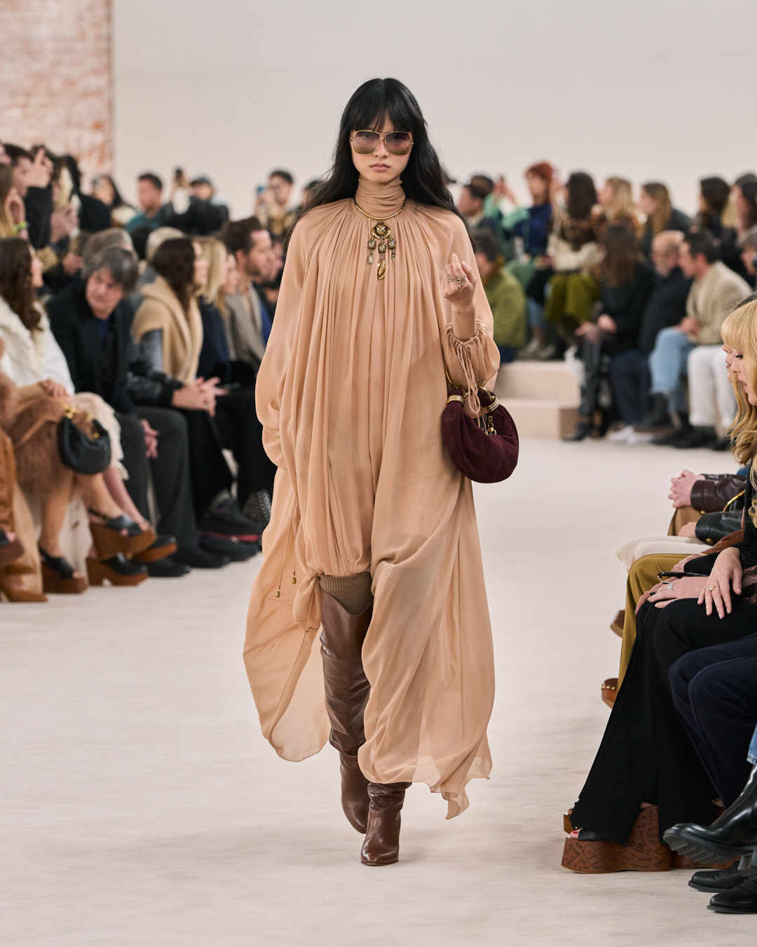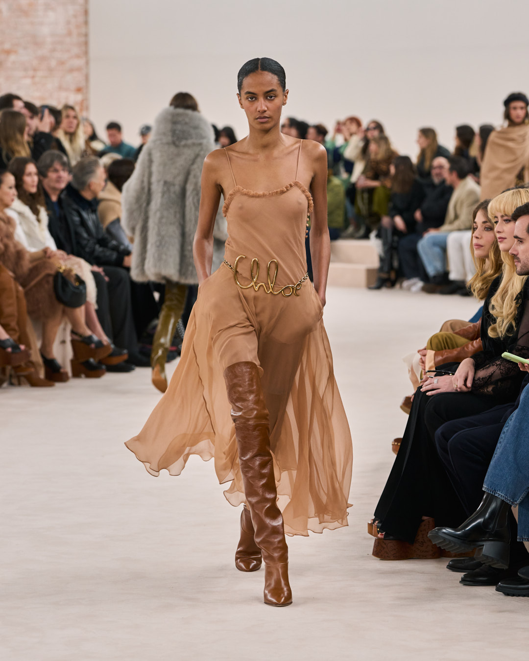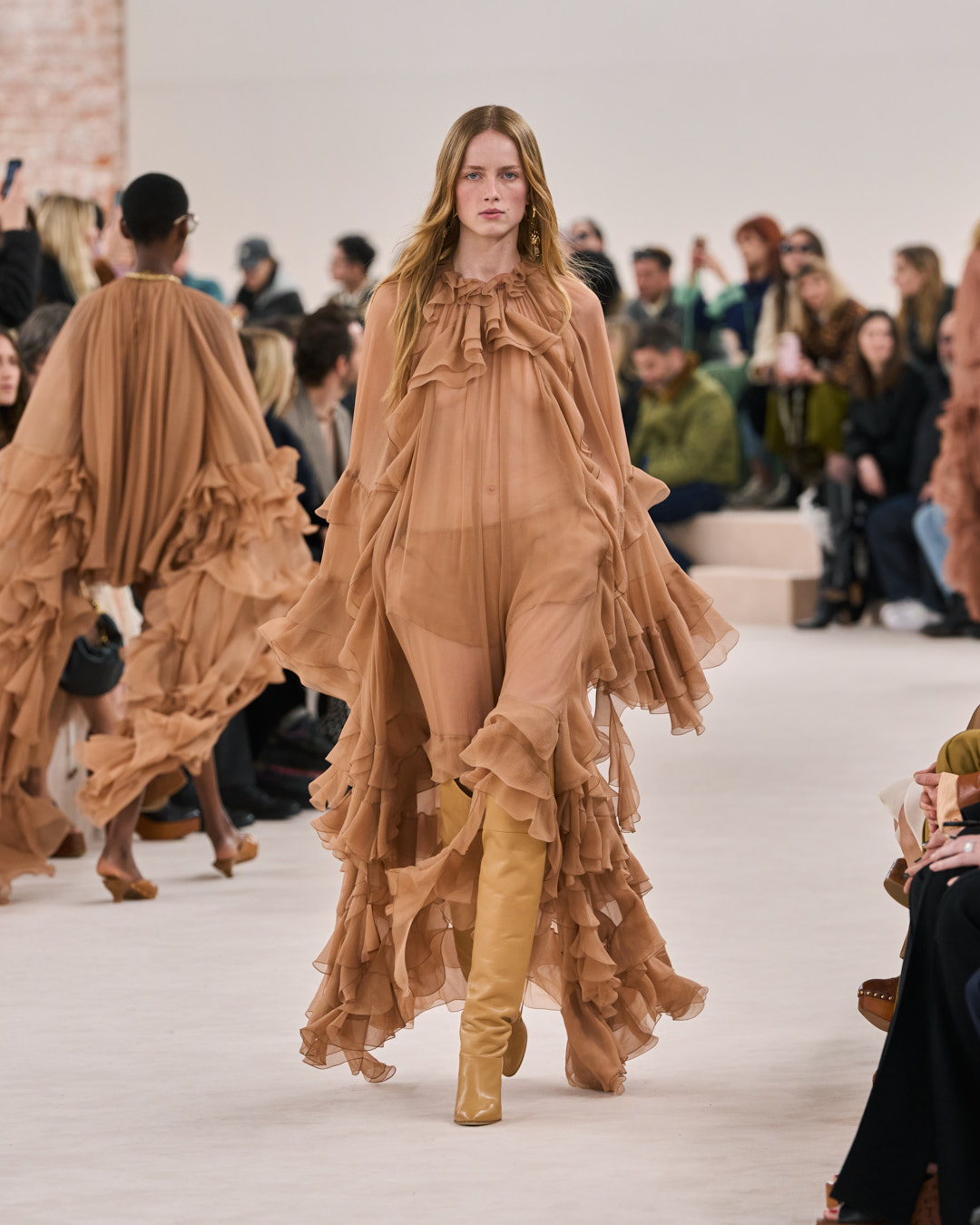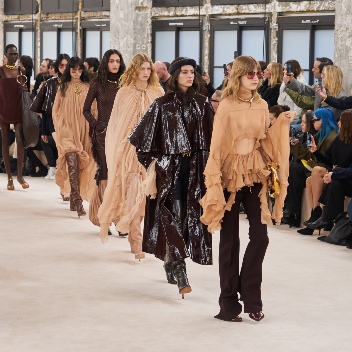 I want to return to the original roots of the house and build a sensual Chloé that radiates with warmth and positivity. This collection goes back to the late 1970’s era of the house that I feel so connected to. A time that was about a natural femininity. Sensual, effortlessly powerful and free. The fluidity, motion, and movement of the Chloé silhouette is all about this freedom. I want to play with contrasting proportions in the silhouette, in an intuitive way. To embrace and capture the Chloé woman’s essence, and all the contradictions she embodies. This is what defines the Chloé attitude.