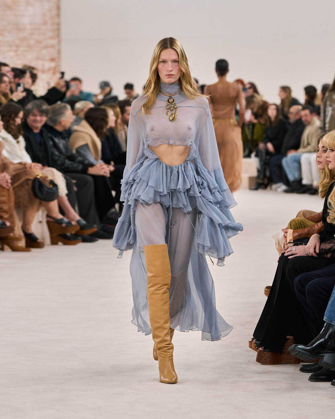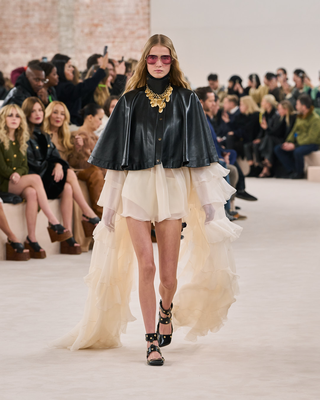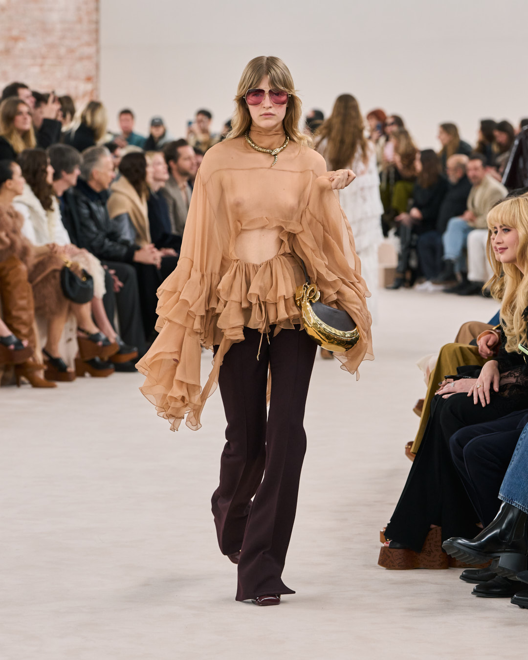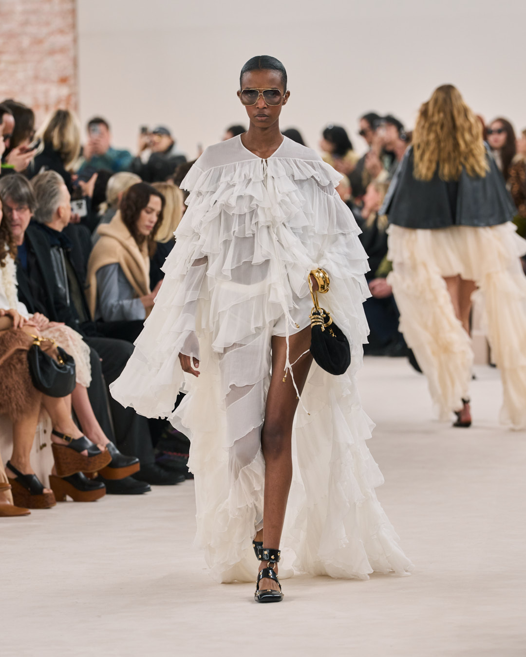 I want to return to the original roots of the house and build a sensual Chloé that radiates with warmth and positivity. This collection goes back to the late 1970’s era of the house that I feel so connected to. A time that was about a natural femininity. Sensual, effortlessly powerful and free. The fluidity, motion, and movement of the Chloé silhouette is all about this freedom. I want to play with contrasting proportions in the silhouette, in an intuitive way. To embrace and capture the Chloé woman’s essence, and all the contradictions she embodies. This is what defines the Chloé attitude.